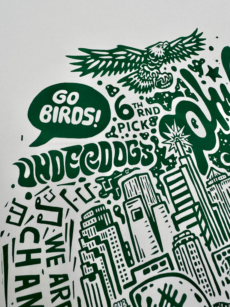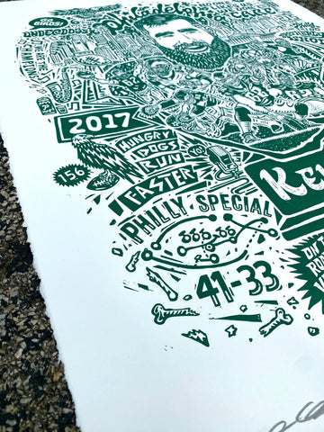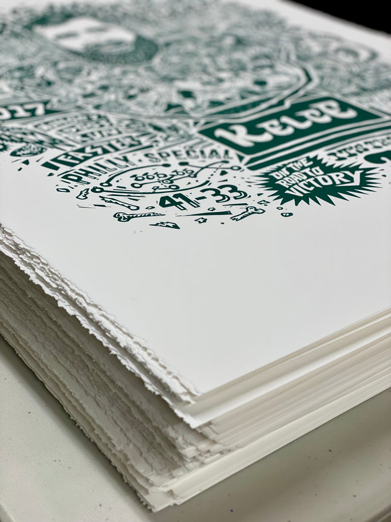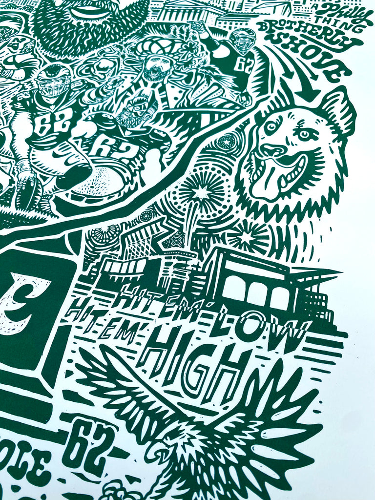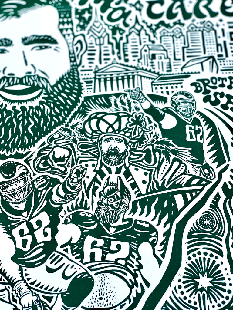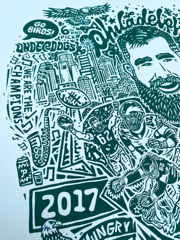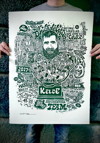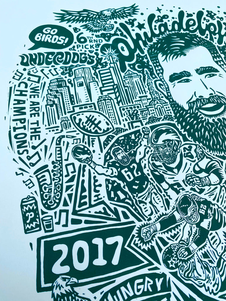 Bought the Jason Kelce print and put it in a frame to give as a gift, it was a hit! I was impressed with all the fun details and the high quality of the paper. What a great way to capture Kelce and that magical Super Bowl year!
